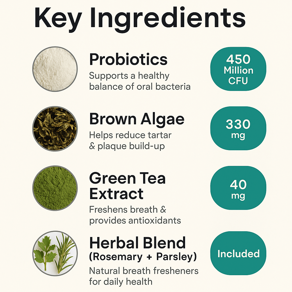 Bacillus coagulans (postbiotic/probiotic support) helps maintain a balanced oral microbiome linked to odor and gum comfort.